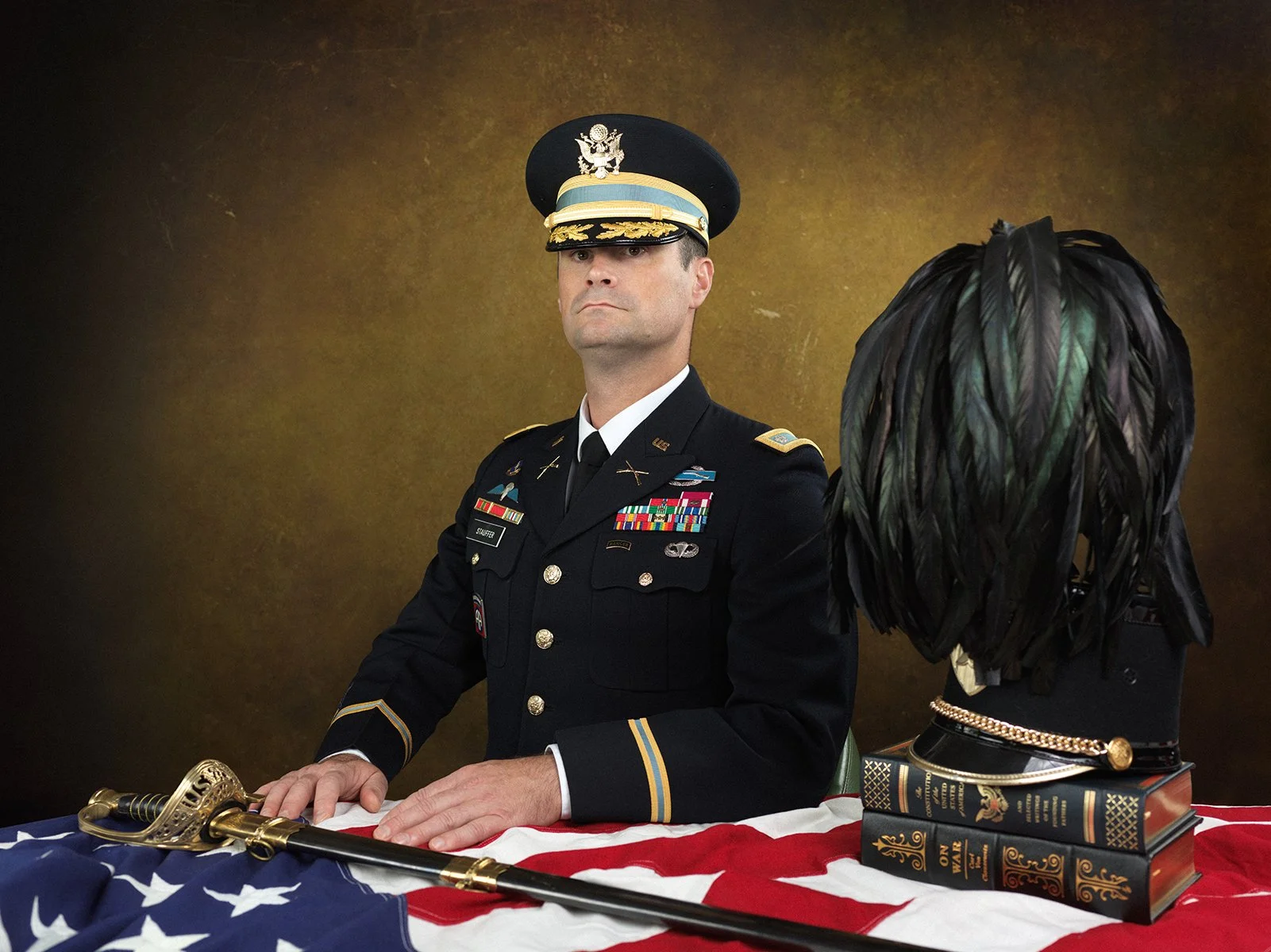 For the second composition, I created a more dramatic “table scene,” a hallmark of my military portraiture. Here, Lt. Col. Stauffer was photographed seated at a draped table of stars and stripes, flanked by meaningful symbols of his profession: an officer’s sabre, a plumed shako resting on a stack of military history books, and the subdued, timeless tones of a textured backdrop. These elements were carefully chosen to echo themes of heritage, authority, and service. The arrangement not only emphasizes the gravity of his role but also creates a narrative frame that connects the subject to the proud traditions of the Army.