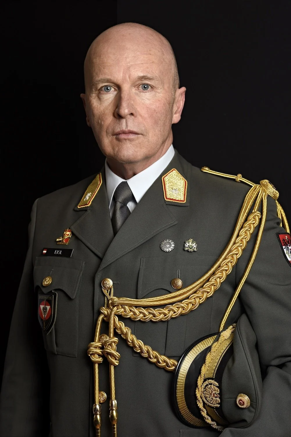 The portrait was carefully constructed through strong, upright poses and deliberate composition. Shooting from lower angles, I emphasized stature, responsibility, and the ceremonial gravity of Brigadier Eisl’s role. Direction was restrained and purposeful, encouraging a solemn, stately presence that reflected both the individual and the office he held.